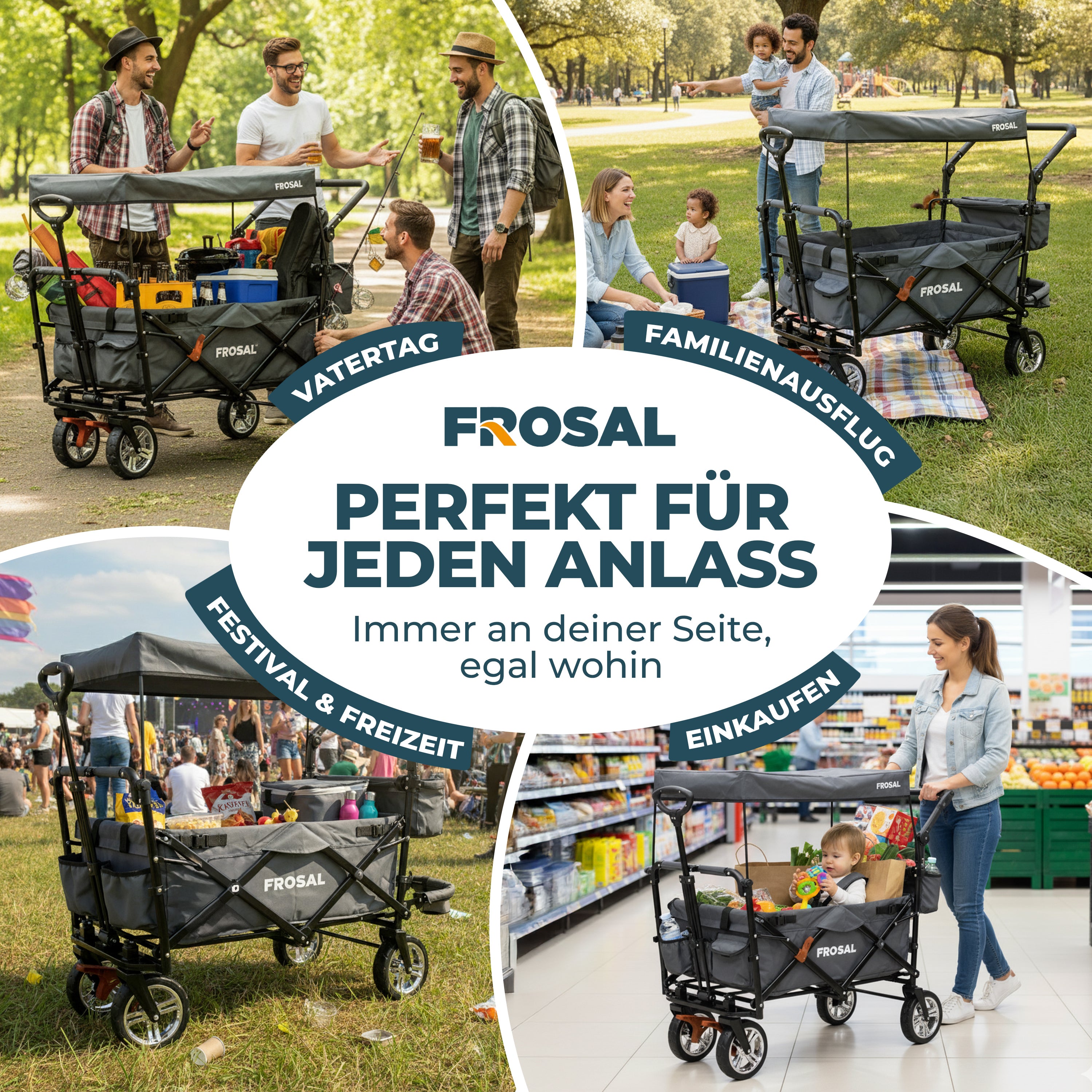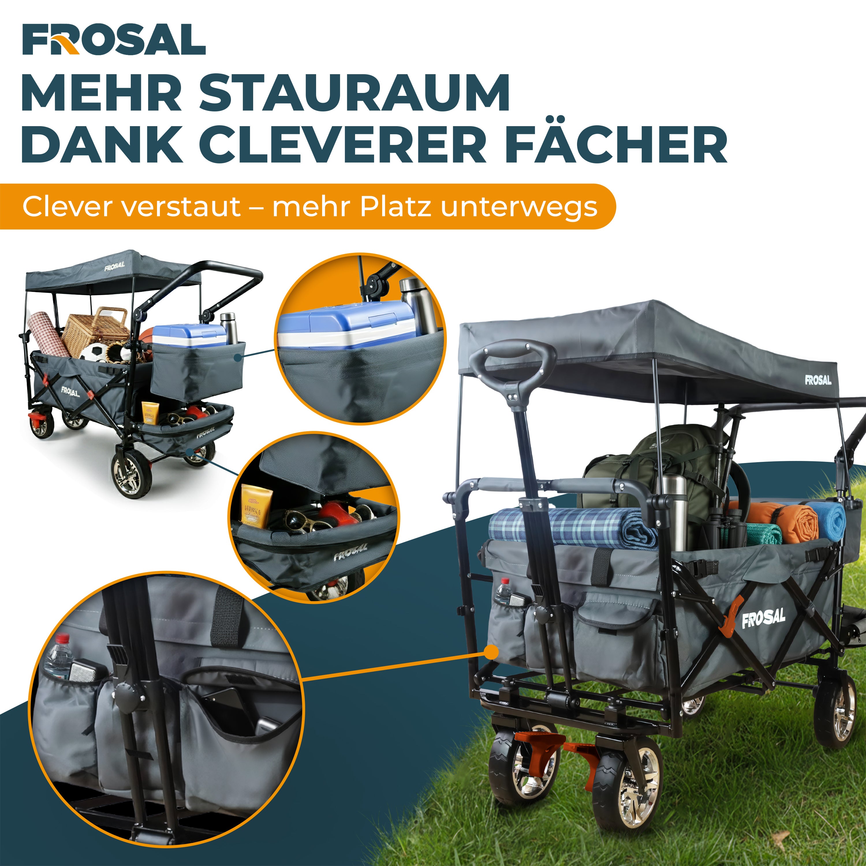 FROSAL Faltbarer Bollerwagen Leo mit Sonnendach und Stauraumerweiterung